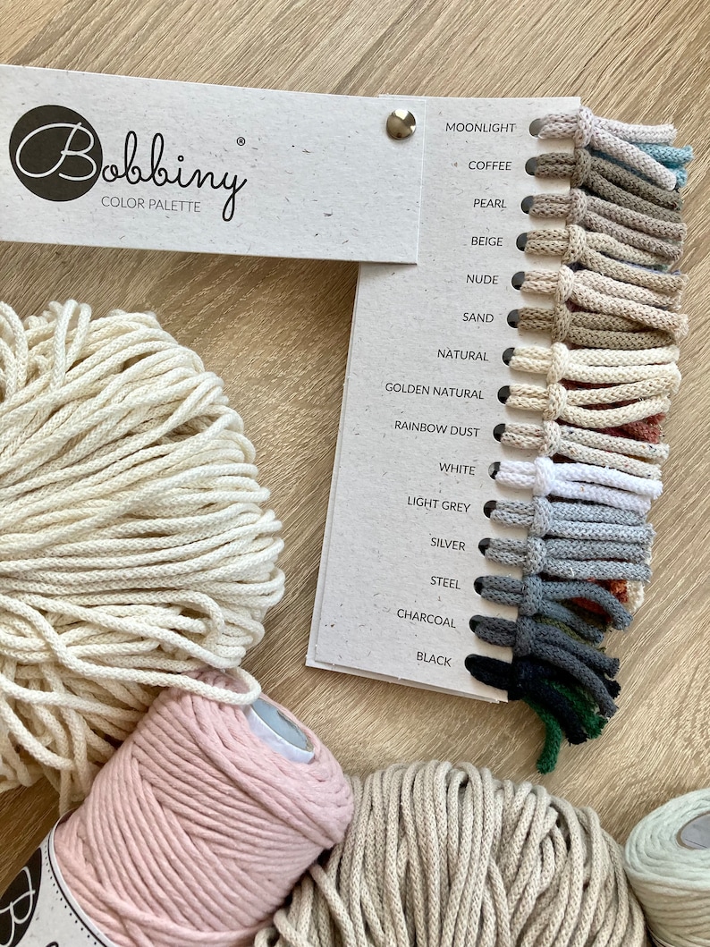 Bei der Variante Bobbiny Premium Makramee 3 mm Makramee Garn 3mm Bobbiny Etsy.deâ3mm gezwirnt/3mm twistedâ PERLE Bobbiny Makramee Garn 3mm 100m Yarn Cornerwerden insgesamt 56 Fasern zu einer 3mm Makramee Kordel verzwirnt.